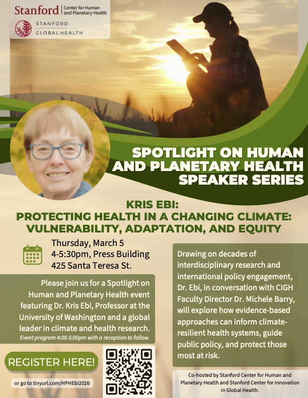 Please join the Stanford Center for Human and Planetary Health (HPH) and Stanford Center for Innovation in Global Health (CIGH) for a Spotlight on Human and Planetary Health Keynote with Dr. Kris Ebi.