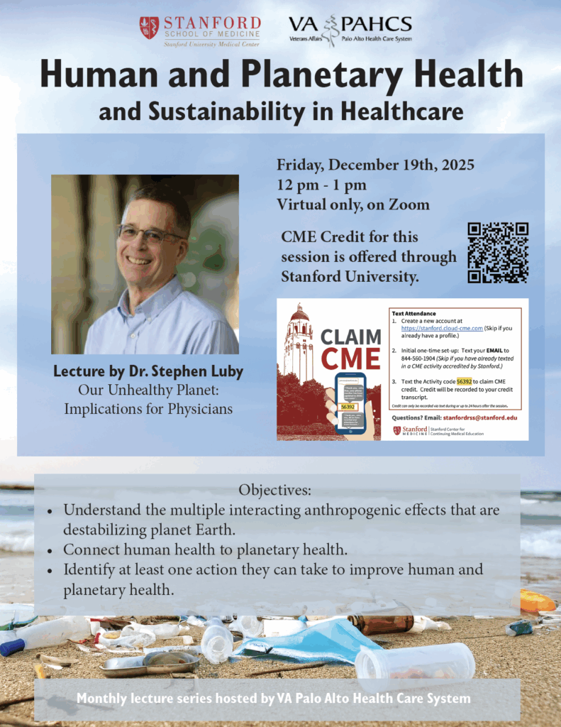 Please join us for this month’s Stanford/VAPAHCS Human and Planetary Health (HPH) virtual lecture on Friday, December 19th from 12 pm – 1 pm on Zoom.