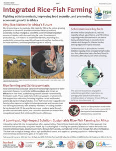 This communication project seeks to address the risk of schistosomiasis transmission in Africa, a parasitic disease that is contracted when contact is made with contaminated bodies of water. Rice paddies provide an ideal habitat for freshwater snails that carry the parasite responsible for schistosomiasis, creating a significant occupational hazard for rice farmers. A fact sheet was generated to help guide stakeholders in helping implement a cheap and effective biological solution for small-scale farms: the introduction of fish, the natural predators of the ‘snail vectors’. Integrated rice-fish farming not only minimizes the risk of contracting schistosomiasis but also improves food security, decreases the need for fertilizer, increases rice yield, and serves as a form of dual production. Thus, farmers not only remain healthy, but their incomes are greatly bolstered by introducing fish into their paddies.