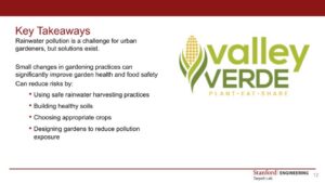 Valley Verde is a San José-based nonprofit that empowers low-income Latino families to grow their own food through urban gardening, but access to safe, affordable water remains a persistent challenge for the communities they serve. My SWAP project aimed to better inform Valley Verde on the policy and environmental considerations surrounding water collection for urban gardening. This took shape across two deliverables: a detailed analysis of the major events shaping California’s water system from roughly 1975 to the present, organized around themes of water quality and regulation, ecosystem restoration, drought, infrastructure, and nutrient recovery; and a presentation examining how collected rainwater affects urban gardening in Valley Verde’s context, with practical solutions for reducing contaminant levels to protect both plant and human health. The presentation has since been shared with stakeholders, and Valley Verde is actively considering the recommendations as they evaluate their water practices going forward.